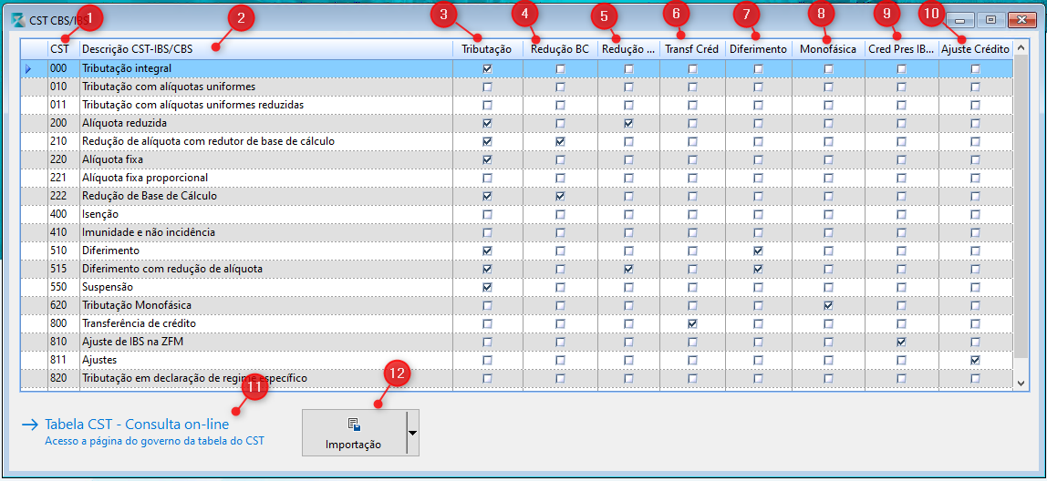 - Transf Cred: Indica se a CST tem transferência de crédito de imposto (item 6);