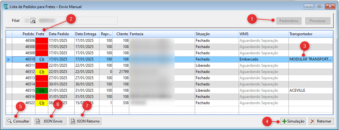Para iniciar uma nova simulação, basta posicionar na lista em um pedido que a coluna esteja em VERMELH?O na coluna "Frete" e clicar no botão "Simulação" (item 4).