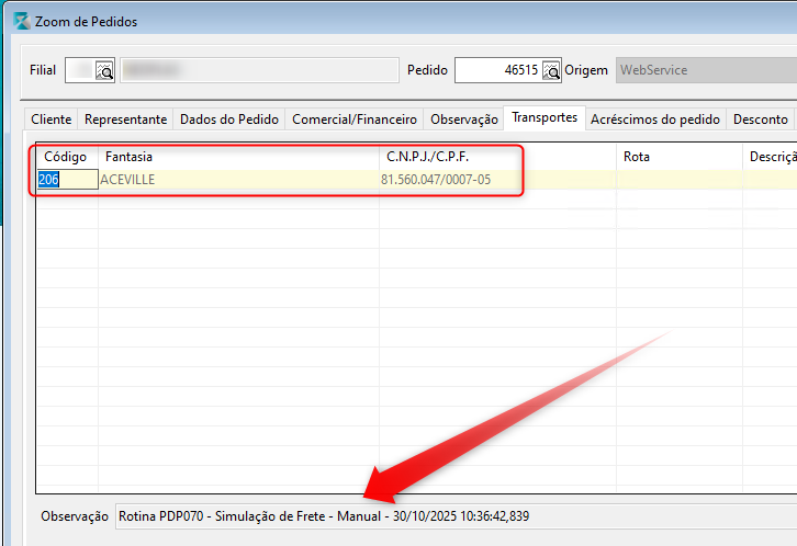 Uma vez selecionado o transportador, o registro é gravado como fornecedor de transporte do pedido, consolidando a informação dentro do SGE.