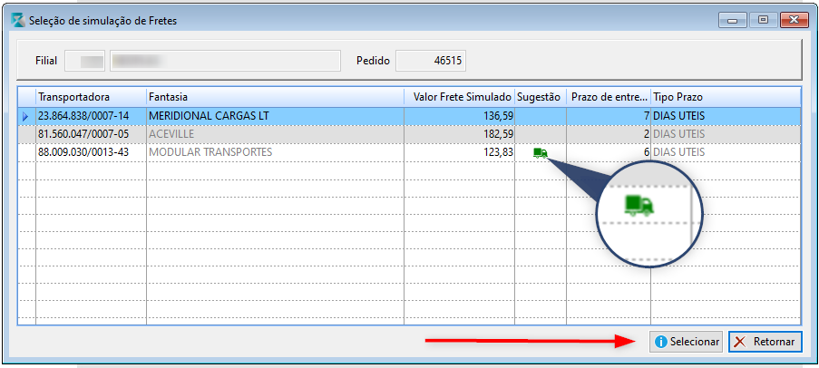 O sistema irá sugerir automáticamente o melhor valor de frete, colocando na coluna "Sugestão", uma imagem de um caminhão verde.