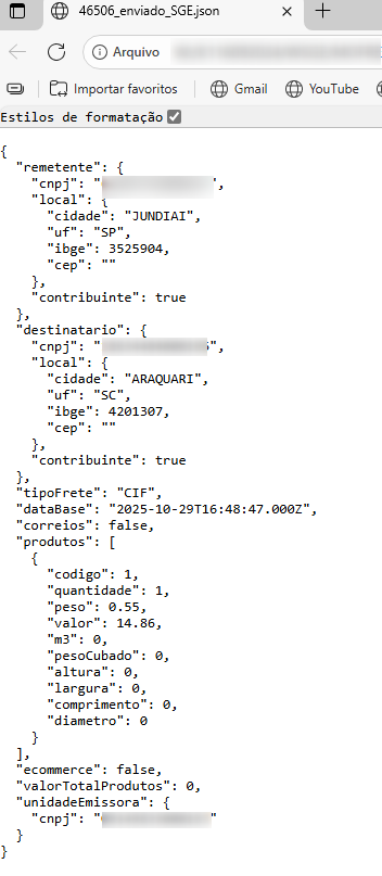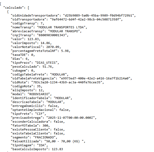 Acima, exemplo de layout do retorno de solicitações de simulação de frete.