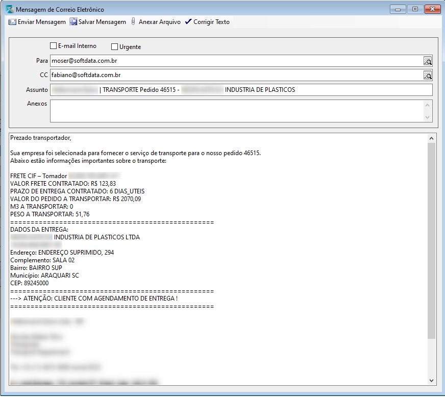 O objetivo deste e-mail é comunicar o transportador que ele foi selecionada para fazer o transporte do pedido. Os textos são pré-configurados em arquivo CFG, mas pode ser acrescentado alguma informação manualmente.