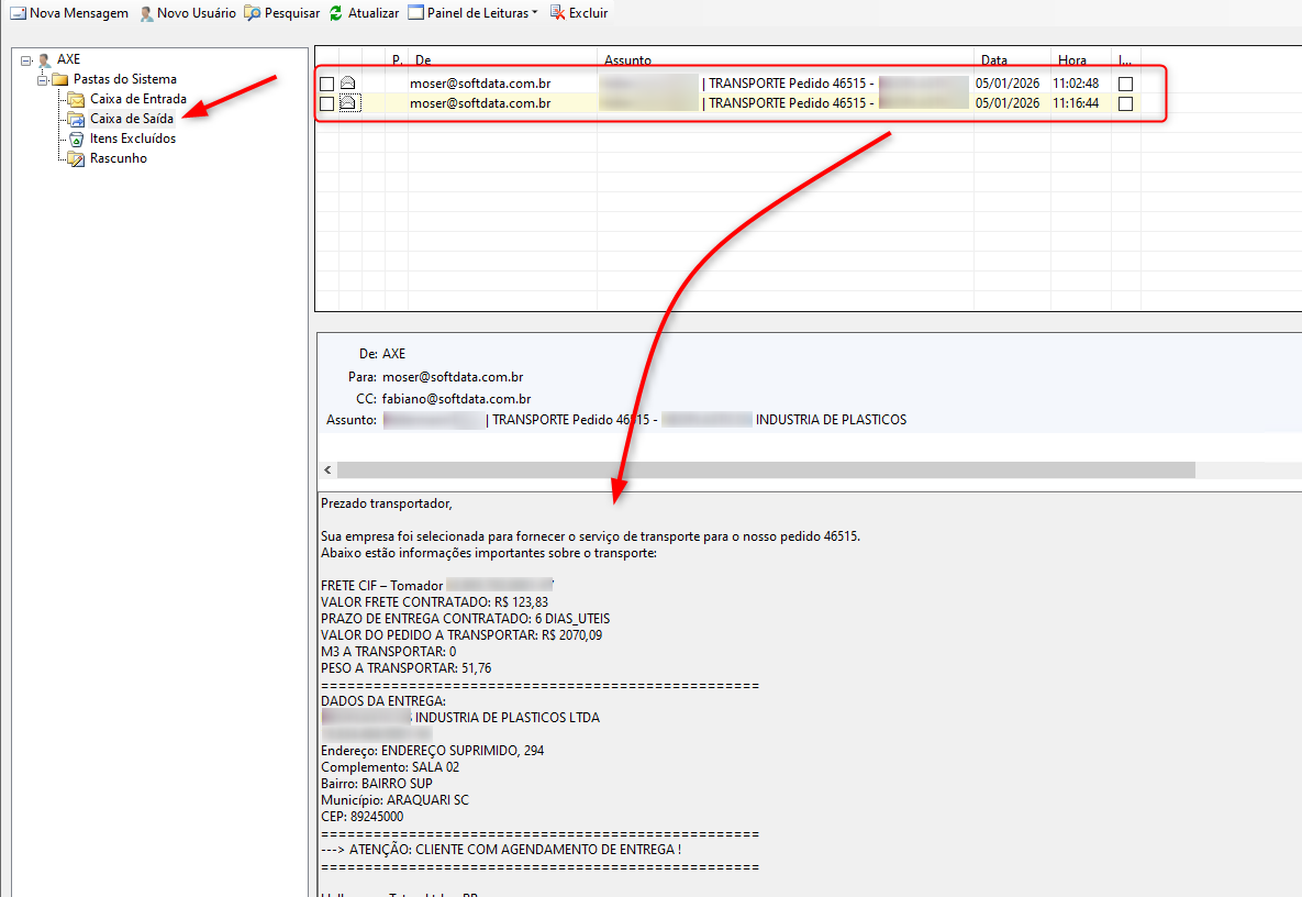 Os parâmetros abaixo serão usados para o envio do e-mail ao fornecedor de transporte: